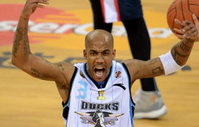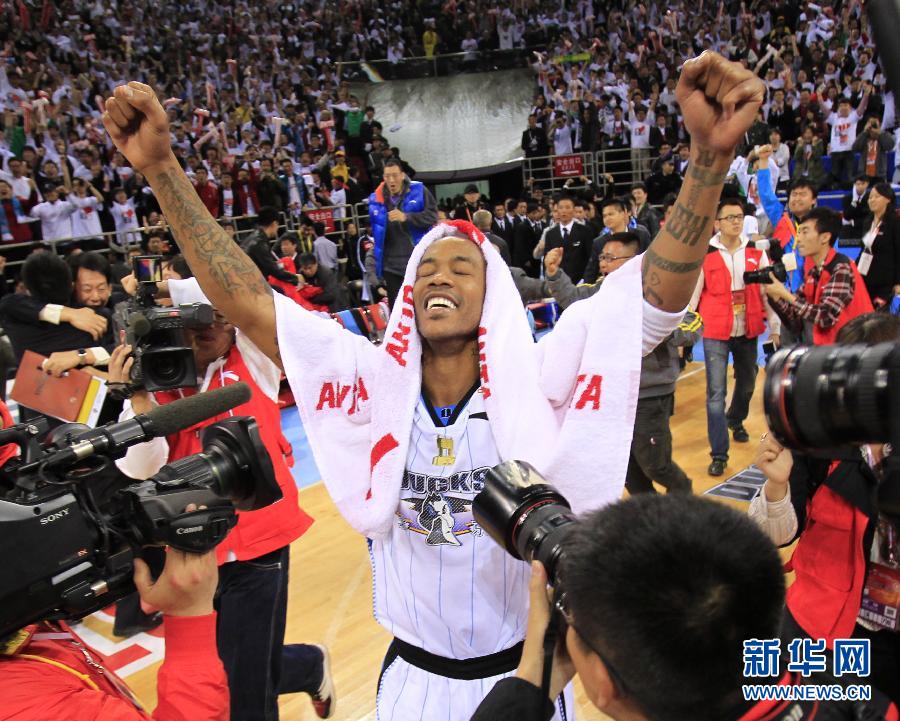 3月30日,北京金隅隊球員馬布里慶祝奪冠。當日,在北京進行的2011-2012中國男子籃球職業聯賽(CBA)總決賽第五回合比賽中,北京金隅隊主場以124比121戰勝廣東東莞銀行隊,以4比1的總比分奪得本賽季總冠軍,這是北京隊在CBA歷史上首次奪冠。新華社記者孟永民攝