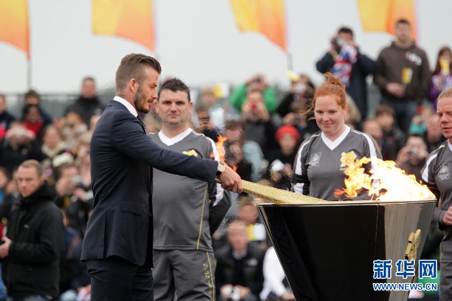 5月18日,在英國康沃爾德卡爾德羅斯皇家海軍航空站,英國足球巨星貝克漢姆(左一)用圣火引燃的火炬點燃了安放在飛機跑道上的一個圣火盆。當天,倫敦奧運圣火搭乘英國航空公司BA2012金色專機“螢火蟲”號抵達英國。19日清晨,為期70天,長達8000英里的接力將要展開。新華社發(fā)(倫敦奧組委供圖)