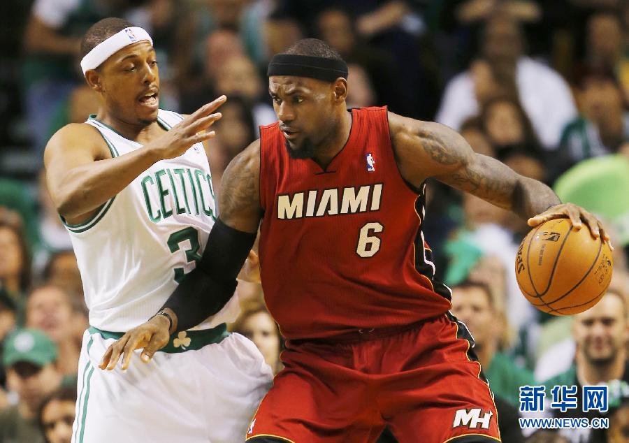 6月7日,熱火隊(duì)球員詹姆斯(右)帶球進(jìn)攻。當(dāng)日,在NBA季后賽東部聯(lián)盟決賽第六場(chǎng)比賽中,邁阿密熱火隊(duì)客場(chǎng)以98比79戰(zhàn)勝波士頓凱爾特人隊(duì),將總比分扳為3比3平。新華社/路透