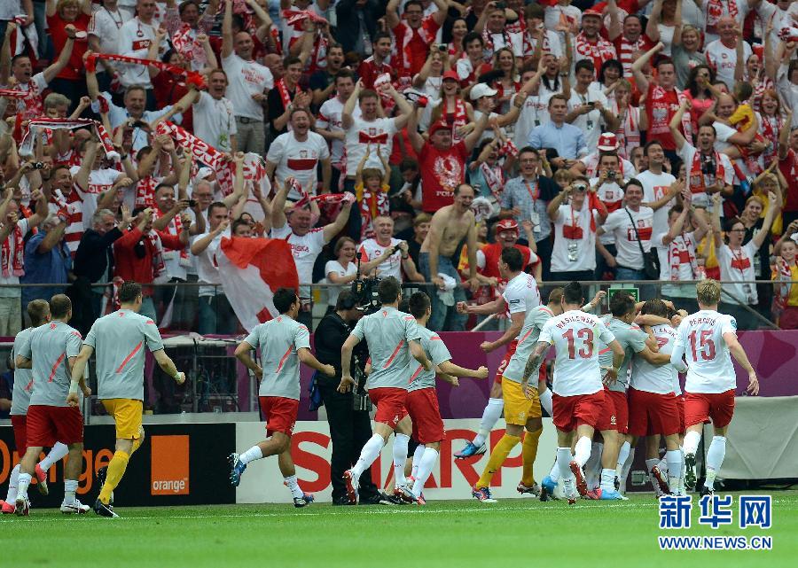 6月8日,波蘭隊球員在比賽中慶祝進球。當日,在2012歐洲足球錦標賽揭幕戰(zhàn)中,東道主波蘭隊以1比1戰(zhàn)平希臘隊。 新華社記者劉力航攝
