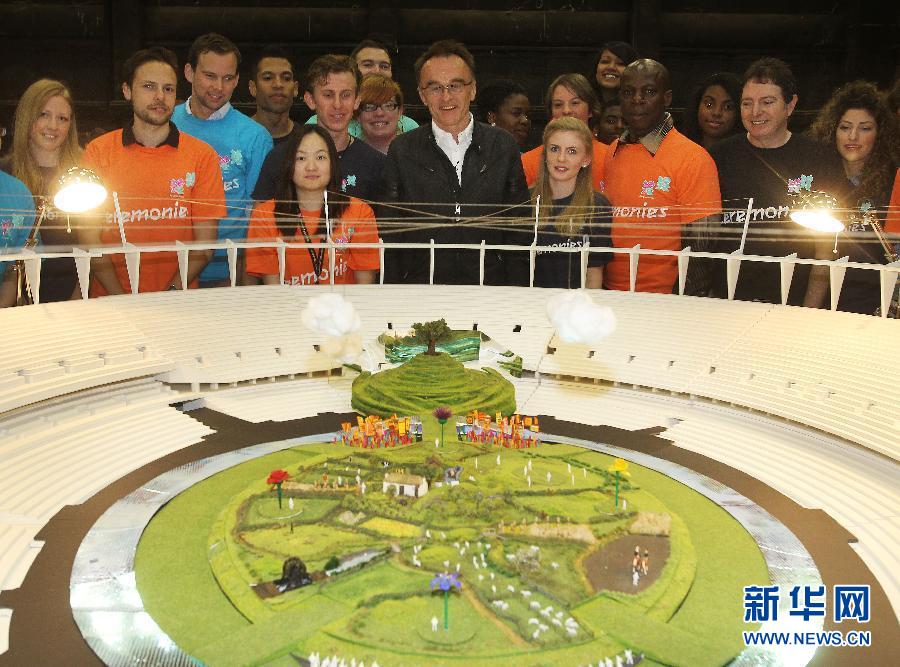 6月12日,倫敦奧運會開幕式導演博伊爾(中)與志愿者和工作人員在開幕式現場模型前合影。當日距離倫敦奧運會開幕還有45天,博伊爾慰問并感謝了10000名參與開幕式準備工作的志愿者和工作人員。新華社發(倫敦奧組委供圖)
