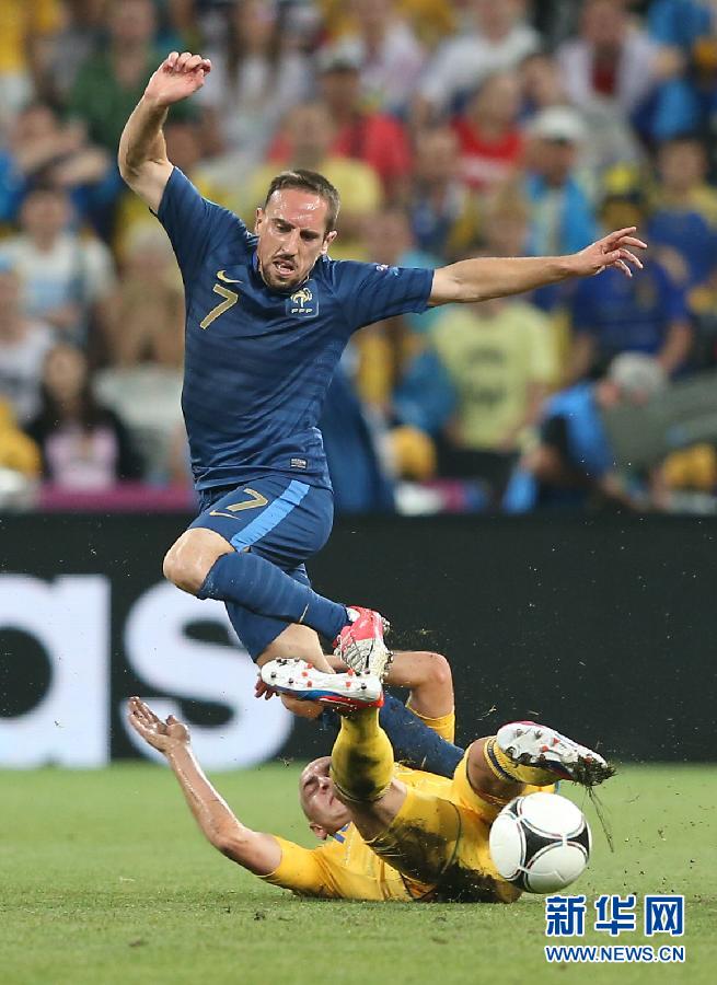 新華社照片,頓涅茨克(烏克蘭),2012年6月16日 (歐錦賽)(1)足球——歐錦賽:法國勝烏克蘭 6月15日,法國隊球員里貝里(上)與烏克蘭隊球員納扎倫科在比賽中拼搶。當日,在烏克蘭頓涅茨克頓巴斯競技場進行的2012歐錦賽D組第二輪比賽中,法國隊以2比0戰勝烏克蘭隊。 新華社記者孟永民攝