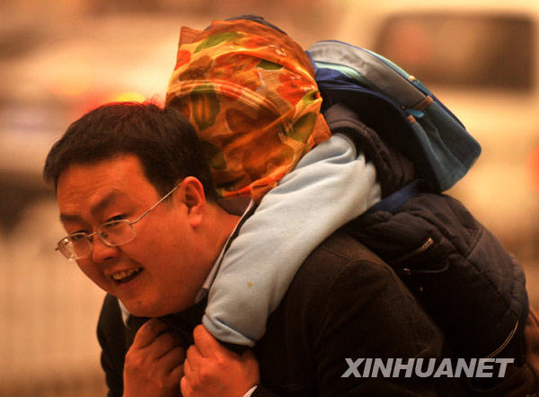 3月19日,一位市民背著“全副武裝”的孩子行走在沙塵中的蘭州街頭。