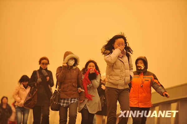 3月20日,市民行走在沙塵中的北京街頭。當日,北京出現沙塵天氣,刮起5至6級大風。新華社記者黃孝邦攝