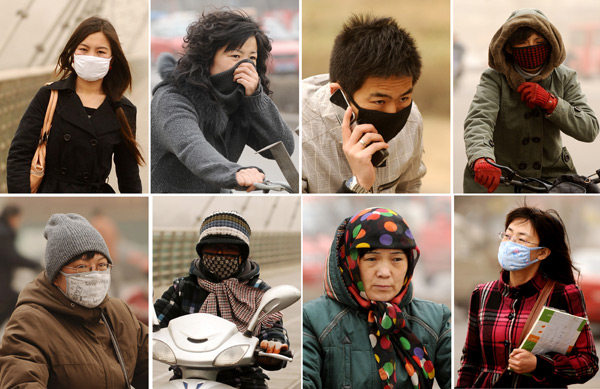 3月22日,太原市民戴上圍巾或口罩應(yīng)對(duì)沙塵天氣(拼版照片)。