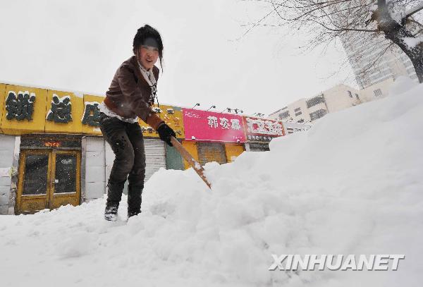 4月13日,市民在清理門前積雪。從12日中午開始,哈爾濱突降大雪。黑龍江省12日發布的暴雪藍色預警和道路結冰黃色預警稱,哈爾濱、佳木斯等地局部有大到暴雪。目前風雪仍在持續。新華社記者王建威攝