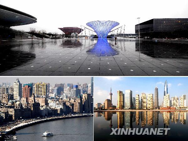 這是2010年4月8日拍攝的上海新地標世博文化中心、中國館、世博軸、主題館(上圖從左至右)和2010年1月26日拍攝的上海老地標外灘(左下)、2009年9月7日拍攝的上海老地標浦東陸家嘴(右下)。