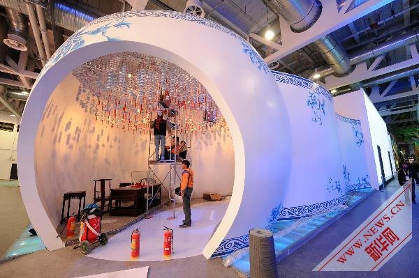 4月15日,在設(shè)計成青花瓷器造型的江西館內(nèi),工人忙著安裝瓷器掛飾。