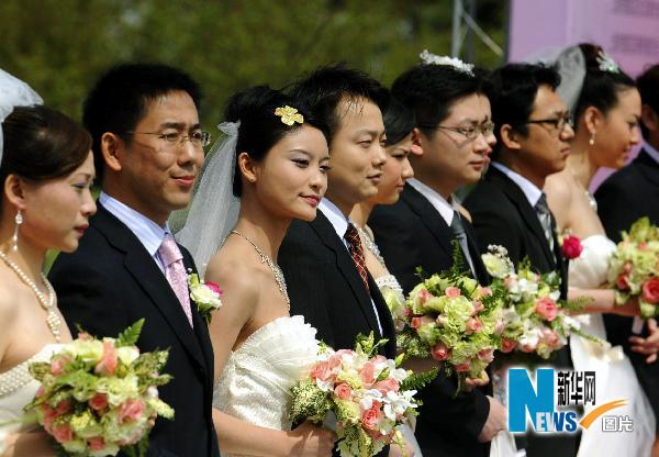 當日,上海12對新人在普陀區長風生態綠地舉行集體婚禮,紀念新中國首部婚姻法頒布60周年,迎接世博會的開幕。 新華社發