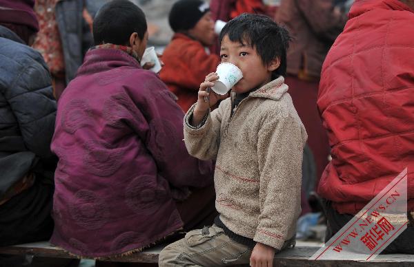 4月16日早晨,一名孩子在玉樹(shù)縣結(jié)古鎮(zhèn)街頭喝著免費(fèi)發(fā)放的稀飯。 新華社發(fā)