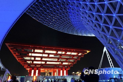 4月24日,上海世博園區內的燈光照明吸引許多游客駐足欣賞。上海世博會開幕在即,各場館紛紛亮燈調試,璀璨絢爛的燈光效果將世博園區映照得流光溢彩、分外迷人。