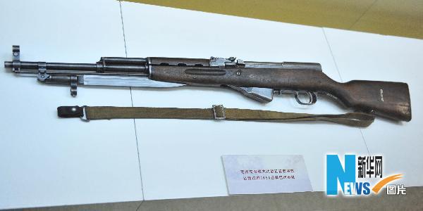 這是毛澤東觀看大比武匯報表演時試用過的1956式半自動步槍(4月26日攝)。 4月26日,中國革命軍事博物館和貴州省博物館聯(lián)合舉行新聞發(fā)布會,將于4月27日起在貴州省博物館舉辦為期一個半月的“名人名槍”展。展覽將展出中國軍事博物館館藏的槍械珍品99支,其中49件屬國家一級文物。新華社記者 楊楹 攝