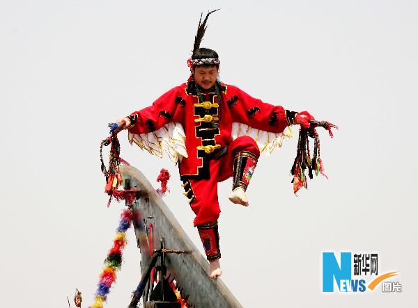 5月2日,貴州民間表演藝術家吉靖羽在刀刃上赤腳行走。