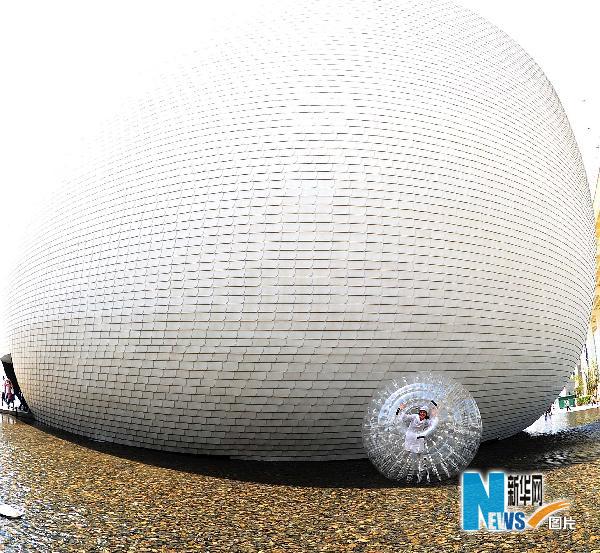 5月3日,皮特凱寧在水上步行球中向觀眾招手。在上海世博園的芬蘭館外,芬蘭姑娘基爾西·皮特凱寧操作水上步行球歡迎游客。新華社記者徐家軍攝