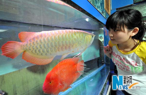 5月7日,在貴陽市萬東橋下的志強水族館,一名女孩在觀賞一條罕見的“紅龍”觀賞魚。