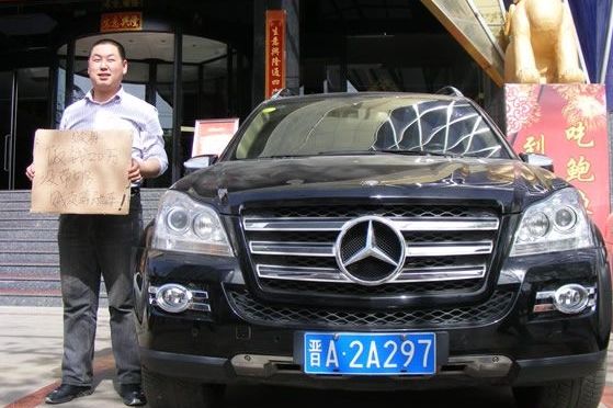 近日,一男子在某飯店門口打出招牌,賤賣自己的奔馳車以償還飯錢。