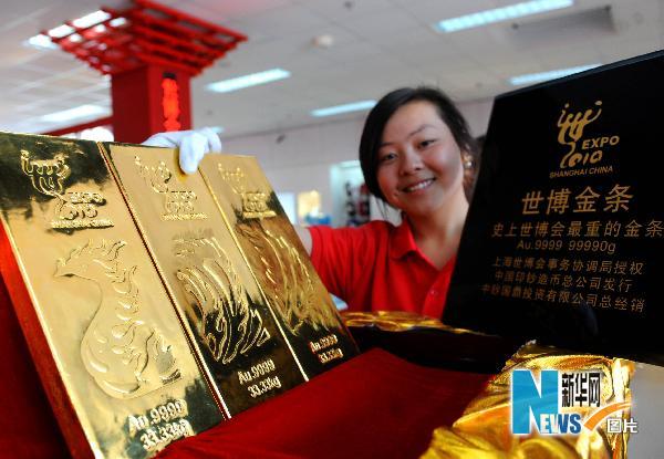 當日,由上海世博局授權,中國印鈔造幣總公司發行,中鈔國鼎投資有限公司總經銷的“世博金條”亮相世博園區。這款金條由三根成色為AU.9999的金條組合而成,每根金條重達33.33公斤,總重99.99公斤。該產品將中國傳統文化中的神鳥“鳳凰”,與上海世博會巧妙的結合成“2010”字樣,以鳳首、鳳身、鳳尾為主畫面,組成一幅展翅起舞的“鳳凰來儀”圖案;金條背面“城市,讓生活更美好”的世博主題,與上海的城市建筑剪影相結合,具有鮮明的時代特色和獨特的歷史意義。新華社發(趙晶攝)