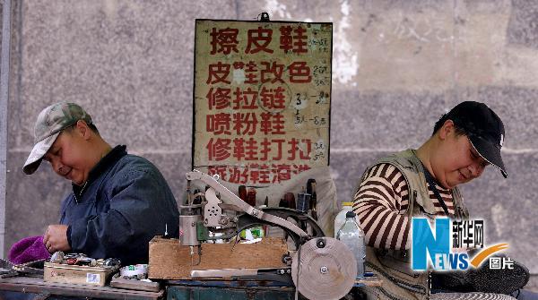 “我們干點啥吧?”哥倆開始琢磨著咋樣才能讓日子過好一點。聽說有位原來的同事在擺攤修鞋,兄弟倆決定去學藝。同事出攤時,兄弟倆就在一旁看,回家后就自己動手修,家里能穿的、不能穿的鞋子,都被他們找出來修了個遍。不到一個月,兄弟倆就在四平街25號樓前擺起修鞋攤,這一擺就是16年。與其他修鞋攤不同,謝晨和謝晶的工具箱里多了幾張紙和兩支筆,為的是和顧客們溝通。由于老顧客越來越多,有些顧客只需要簡單打幾個手勢就能交流了。 16年來,無論寒冬還是炎夏,他們的修鞋攤出攤風雨無阻。兄弟倆兢兢業業,認真對待每一位顧客,專心去修每一雙鞋。久而久之,他們的小鞋攤在附近越來越有名氣,來修鞋的顧客也越來越多,收入自然就越來越好。如今,謝晨和謝晶已步入中年。他們的孩子都已長大成人、大學畢業。謝晶在紙上告訴記者,最驕傲的事是孩子讀了大學。夕陽斜下,兄弟倆準備收工,兩雙沾有鞋油和膠水的手握在一起,互相加油鼓勵,他們在無聲的世界里傳遞著幸福。新華社記者 姚劍鋒攝