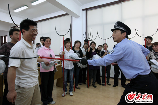 大眾網濟南5月19日訊(記者 曹亮 通訊員 孫悅)“加強校園安全,重在防范”,今天下午,濟南市市中區白馬山派出所聯合白馬山街道辦事處在濟南市育才中學,將一批防護設備免費分發給轄區內29所幼兒園和中小學學校,并向各學校保衛人員傳授防護設備使用技巧。 本次發放的有頭盔、防割手套、警棍、防護杈四種防護設備,是濟南市市中區白馬山派出所與白馬山街道辦事處籌資1萬余元購買。其中防護杈是白馬山派出所根據校園頻發突發事件獨自設計制作,在今天下午的防護演練中,防護杈一招制敵,可讓就侵犯人員束手就擒。