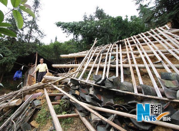 5月19日,特大暴雨過后,廣西融安縣雅瑤鄉(xiāng)雅瑤村大弄屯村民在倒塌的房屋前清理物品。