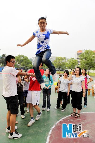 5月25日,湖北省宜昌市第七中學的高三學生參加“減壓游戲”。當日,湖北省宜昌市第七中學舉行高考“減壓游戲”活動,請心理咨詢師來到校園,為500多名即將參加高考的學生“減壓”。 新華社發(黃翔攝)