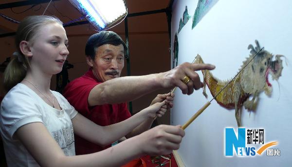 5月26日,俄羅斯兒童在大連賞槐會“民族風情周”活動中體驗“皮影戲”。當日,第21屆大連賞槐會“民族風情周”活動在南山風情一條街舉行。大連復州城民間藝人表演的傳統皮影戲受到中外游客的喜愛,俄羅斯兒童到后臺向老藝人們學起了“皮影戲”。新華社發(盧國忠 攝)