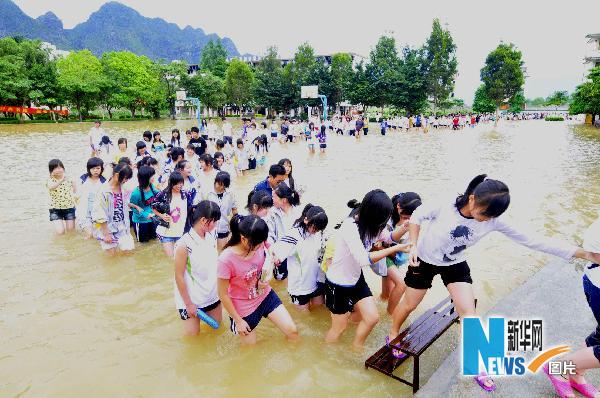 6月2日,廣西都安瑤族自治縣第二高中學生在校園里涉水行進。