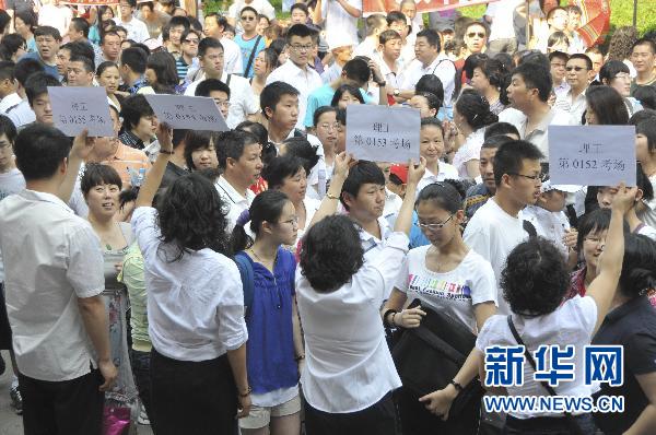 6月7日,幾名教師在哈爾濱市第三中學(xué)考場(chǎng)外舉著標(biāo)有考場(chǎng)號(hào)的牌子為考生服務(wù)。當(dāng)日是2010年全國(guó)高考第一天,共有957萬(wàn)名考生走進(jìn)考場(chǎng)。 新華社發(fā)(張清云 攝)