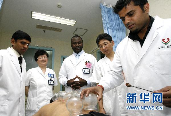 6月9日,來自斯里蘭卡的醫生曼居拉(右一)在中國醫生的指導下學習中醫拔火罐。在上海仁愛醫院,有一批來自世界各地的外國醫生潛心學習中醫針灸、中醫藥、推拿、拔火罐等中醫學知識。這些“老外”表示,中醫提倡的“自然療法”、“預防勝于治療”的觀念已被很多外國人接受,而且越來越受歡迎。新華社記者陳飛攝