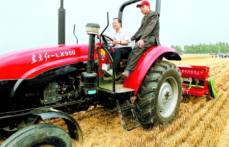 6月10日,溫家寶總理在許昌縣陳曹鄉后孫汪村高產小麥示范區里親自駕駛一臺“東方紅”牌拖拉機,在剛剛收割的麥地里深耕、施肥,種下秋玉米。記者郭宇 攝