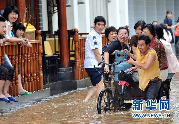 6月17日,桂林市區安新洲小區居民在轉移。當日,廣西桂林市出現大到暴雨、局部大暴雨天氣,部分城區不同程度出現內澇,部分鄉鎮農田和房屋被淹。 新華社記者 陳瑞華 攝