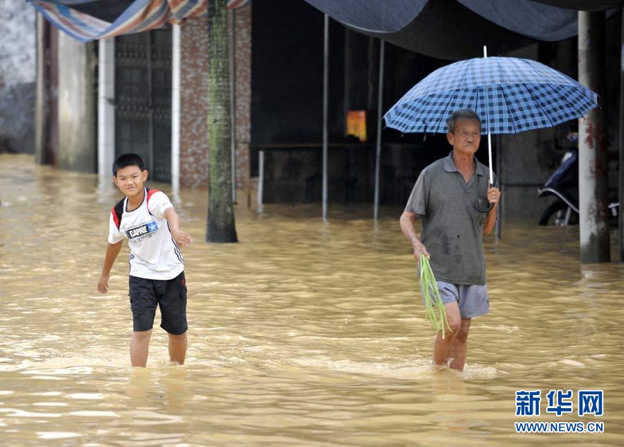 6月26日,在廣東惠來縣隆江鎮葵和路上,當地居民在積水中行走。