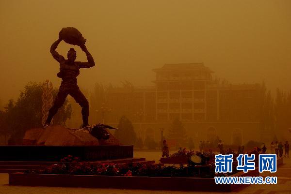 6月27日,甘肅民勤城區沙塵彌漫。當日下午4時左右,甘肅省武威市民勤縣又遭沙塵暴襲擊,黃黑的沙塵迅速籠罩整個縣城,能見度大幅降低。今年4月24日甘肅民勤曾遭特大沙塵暴襲擊。 新華社發(李軍 攝)