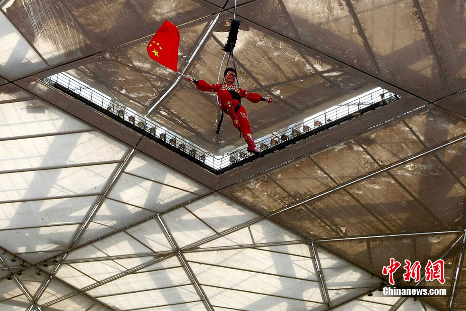 7月2日,在鳥巢上空艱難生活60天之后,高空王子阿迪力告別鳥巢回到地面,同時創造了60天累計連續走綱絲時間最長吉尼斯世界紀錄。圖為阿迪力用吊威亞的方式回到地面。中新社發 富田 攝
