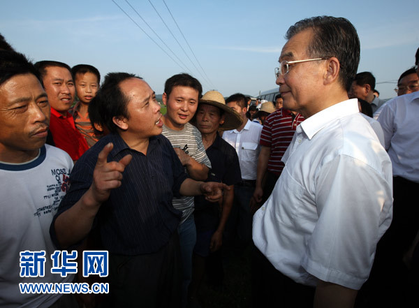 7月1日下午,中共中央政治局常委、國務院總理溫家寶來到湖南考察防汛抗洪工作。在他考察完寧鄉縣大成橋鎮峨山壩工地返回縣城的途中,汽車行至鵲山村邊的一塊稻田旁,有不少農民正站在道路兩旁,向總理招手。溫家寶隨即讓司機停車,走下車來與農民們站在地頭聊了起來。這時,人群中一位中年漢子擠到總理面前:“溫總理,我向您反映一個問題。”溫家寶看著他說道:“你說吧,我來就是要聽聽你們的情況。”