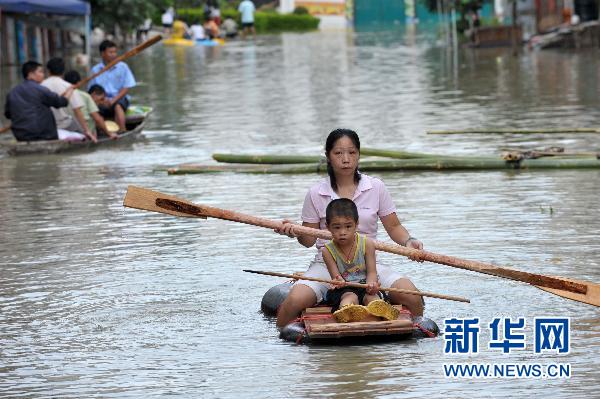 7月2日,在廣西凌云縣沙里瑤族鄉,一對母子乘自制交通工具在被淹沒的街道上行進。