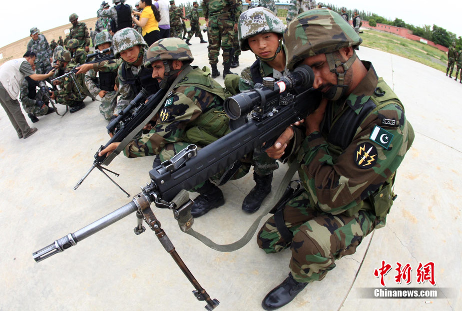 7月3日,代號“友誼—2010”的中國巴基斯坦反恐聯合訓練在中國寧夏青銅峽地區展開,此次訓練主要以邊境地區山地聯合反恐作戰為課題,分為展示交流、混編同訓、綜合演練三個階段。圖為中國巴基斯坦兩軍特戰部隊交流展示反恐裝備。中新社發 杜洋 攝
