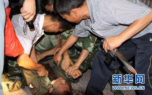7月3日晚,武警寧夏總隊石嘴山市支隊官兵將劫持人質的犯罪嫌疑人抓獲。當晚23時50分許,武警寧夏總隊石嘴山市支隊官兵經過長達3個多小時的談判后,與當地公安干警、消防官兵共同成功處置一起發生在寧夏石嘴山市大武口區武當廟附近的持刀劫持人質案件,犯罪嫌疑人被成功抓獲,人質安全獲救。據了解,犯罪嫌疑人徐某以找朋友名義乘坐張女士的出租車,當車子離開市區后行至武當廟附近時,犯罪嫌疑人徐某持刀將出租車司機劫持為人質,并向出租車司機家人勒索5萬元現金。目前,此案正在進一步審理當中。 新華社發(劉東日 攝)