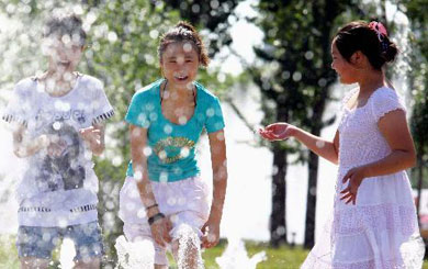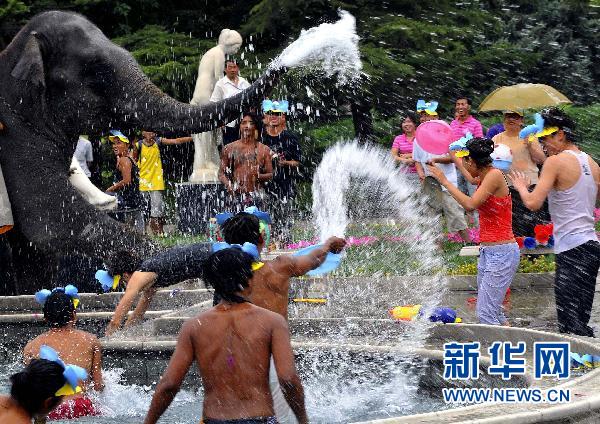 7月7日,北京世界公園的泰國大象和工作人員、游客們一起潑水消暑。盛夏時節,北京世界公園舉辦第四屆泰國大象潑水節,園區的工作人員和游客一起與園內的4頭大象展開“潑水大戰”,納涼消暑。 新華社發(鄭永攝)