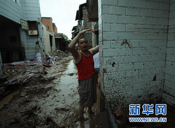 7月9日,一位村民比劃著說:“當時的水比我人還要高。” 當日凌晨,位于三峽庫區的重慶市萬州區分水鎮開始遭受強降雨襲擊,引發山洪、泥石流、山體滑坡等自然災害。強降雨導致大量農田被淹、莊稼被毀,分水場鎮及所轄的三正場鎮被淹,積水深達1.2米。暴雨導致分水鎮6000多間房屋被淹,600多間房屋倒塌,1.5萬人受災并被緊急安全轉移,目前暫無人員傷亡報告。 新華社記者 周衡義 攝