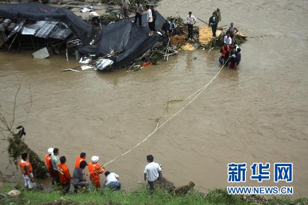 7月15日夜晚,強降雨天氣襲擊湖北省宜昌市,導致夷陵區黃柏河西部支流水域突發山洪,宜(昌)巴(東)高速第七標段工人被困河中。夷陵區消防大隊接到報警后,火速趕赴現場,經過近8小時的緊張營救,成功將60余名被困工人救出。新華社發(方佩 攝)