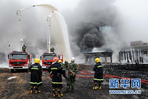 7月17日,消防隊員在火災現場撲火。當日10時,大連市政府召開新聞發布會,宣布大連新港輸油管道爆炸現場儲油罐的所有閥門全部關閉,火勢基本撲滅,事故未造成人員傷亡。 7月16日18時許,大連新港附近中石油的一條輸油管道發生爆炸起火。起火管道為直徑900毫米的原油儲罐陸地輸油管線,后引起700毫米管線起火,油罐沒有起火。燃燒產生氣體主要為含硫和芳烴類氣體,無劇毒。新華社記者 李鋼 攝