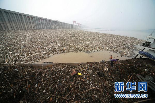 隨著三峽建庫以來最大洪峰經過,大量漂浮物被洪水裹挾而下,迅速積聚在三峽大壩上游近壩水域。中國長江三峽集團公司和武警湖北宜昌市支隊啟動應急機制,出動亞洲最大清漂船“三峽清漂1號”以及15艘機駁船在大壩上游的禁航區清理漂浮物,并將打撈上岸的漂浮物進行環保處理,以確保庫壩區水質以及通航和三峽樞紐運行安全。