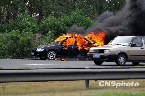 北京連日來持續高溫,7月25日下午17點17時,一黑色轎車在京石高速主路出京方向大興出口處發生自燃,駕駛員報警后大約四十分鐘消防車來到現場,汽車已全部燒成灰燼。中新社發 孫洪杰 攝