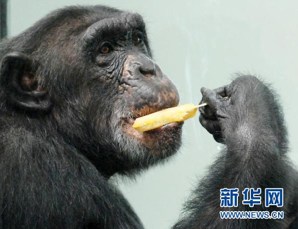 7月28日,在西安秦嶺野生動物園,猩猩艾艾在吃冰棍降溫。 新華社記者丁海濤攝