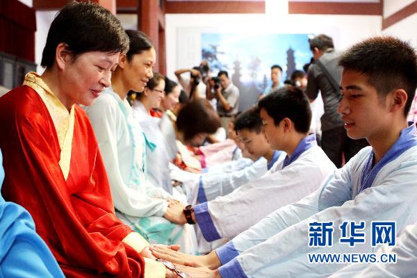 7月29日,中國學(xué)生按照漢朝禮儀跪在母親膝前,感謝養(yǎng)育之恩。