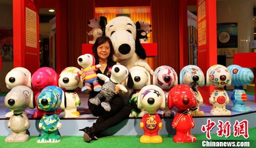 8月5日,為慶祝《花生漫畫/PEANUTS》主角史努比誕生60周年,重慶大都會廣場舉辦“喜迎·60 Snoopy珍藏藝術展”,在重慶展出由多位國際頂級插畫及時裝設計師設計的3D立體史努比雕塑。據介紹,這些史努比雕塑均是首次在中國大陸地區展出。圖為花生漫畫亞太地區版權代理公司的董事總經理展示此次展出的3D立體史努比雕塑。