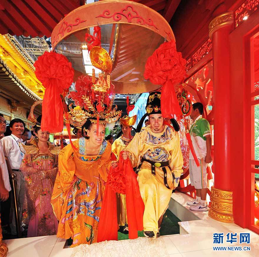 8月14日,在上海世博會陜西館,外國游客在體驗“大唐婚典”。當日,上海世博會陜西館為迎接我國傳統節日“七夕節”而舉辦的“華清池中華情人節系列活動”開幕。兩對外國游客現場體驗了“大唐婚典”,感受中國情人節的浪漫。新華社記者 丁海濤攝