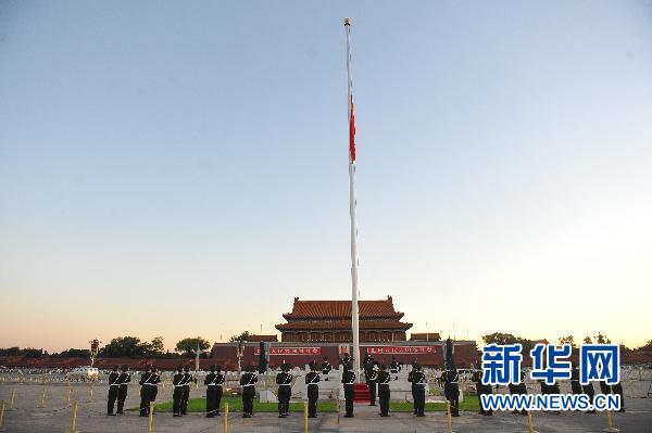 新華網快訊:15日5時25分,天安門廣場舉行例行的升旗儀式后,五星紅旗緩緩降下一半,以哀悼甘肅舟曲特大山洪泥石流災害中遇難的同胞。