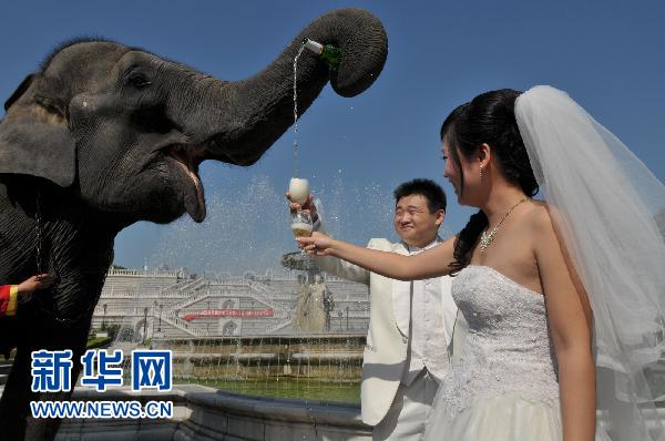 8月16日傳統七夕節到來之際,北京世界公園的一頭非洲大象為一對新人斟酒助興,慶祝節日。每年農歷七月初七的七夕節源于漢代,盛行于唐宋,已有2000多年歷史,是我國傳統節日中最具浪漫色彩的節日。 新華社發(鄭永 攝)